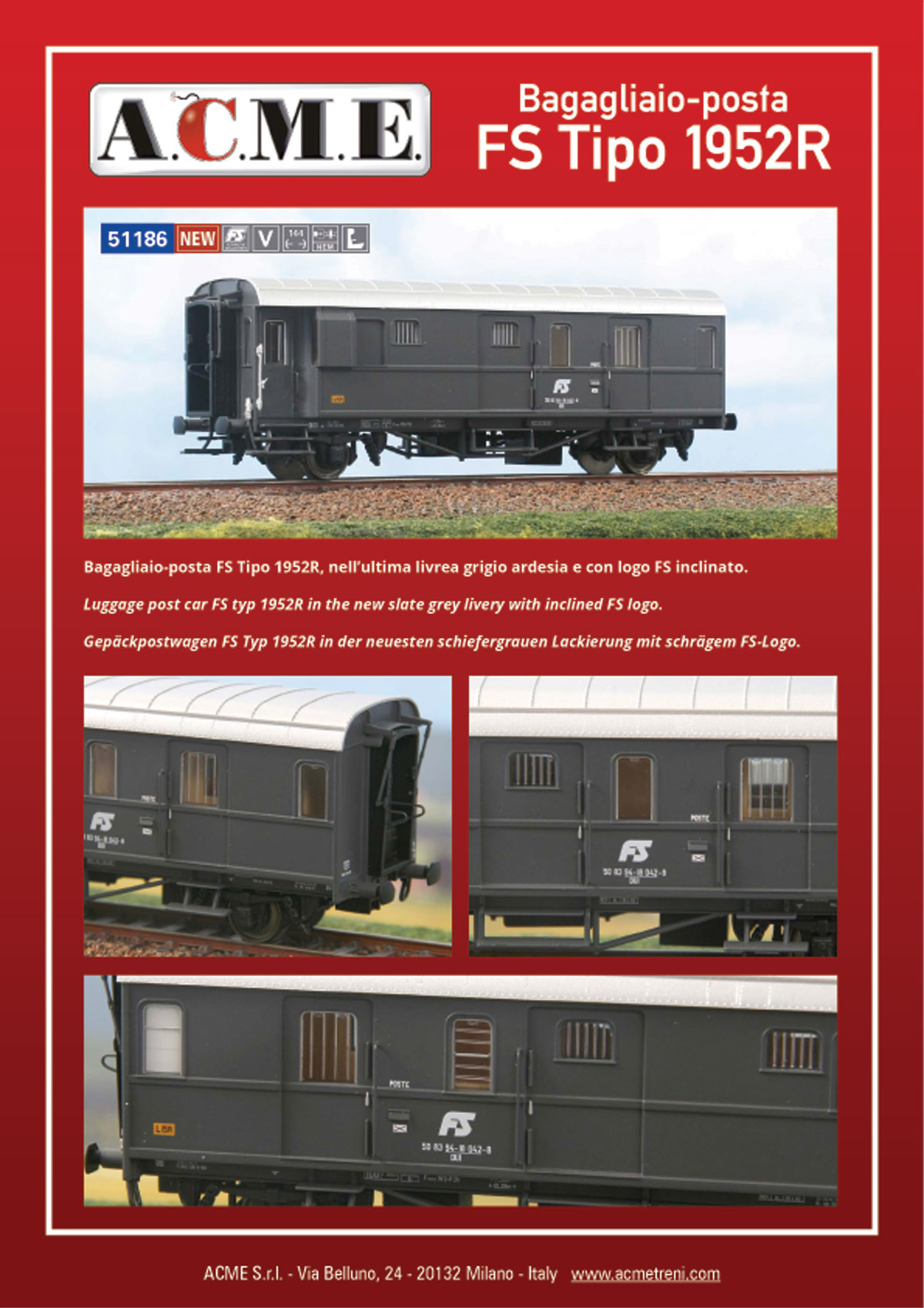 Bagagliaio-posta FS Tipo 1952R, nell’ultima livrea grigio ardesia e con logo FS inclinato.
