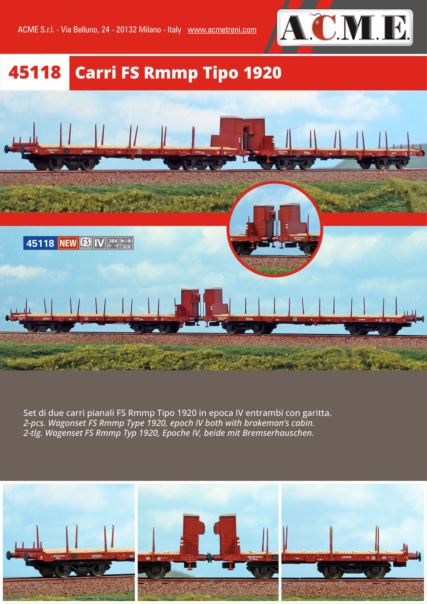 ACME H0 45118 - Set di due carri pianali FS Rmmp Tipo 1920 in epoca IV entrambi con garitta