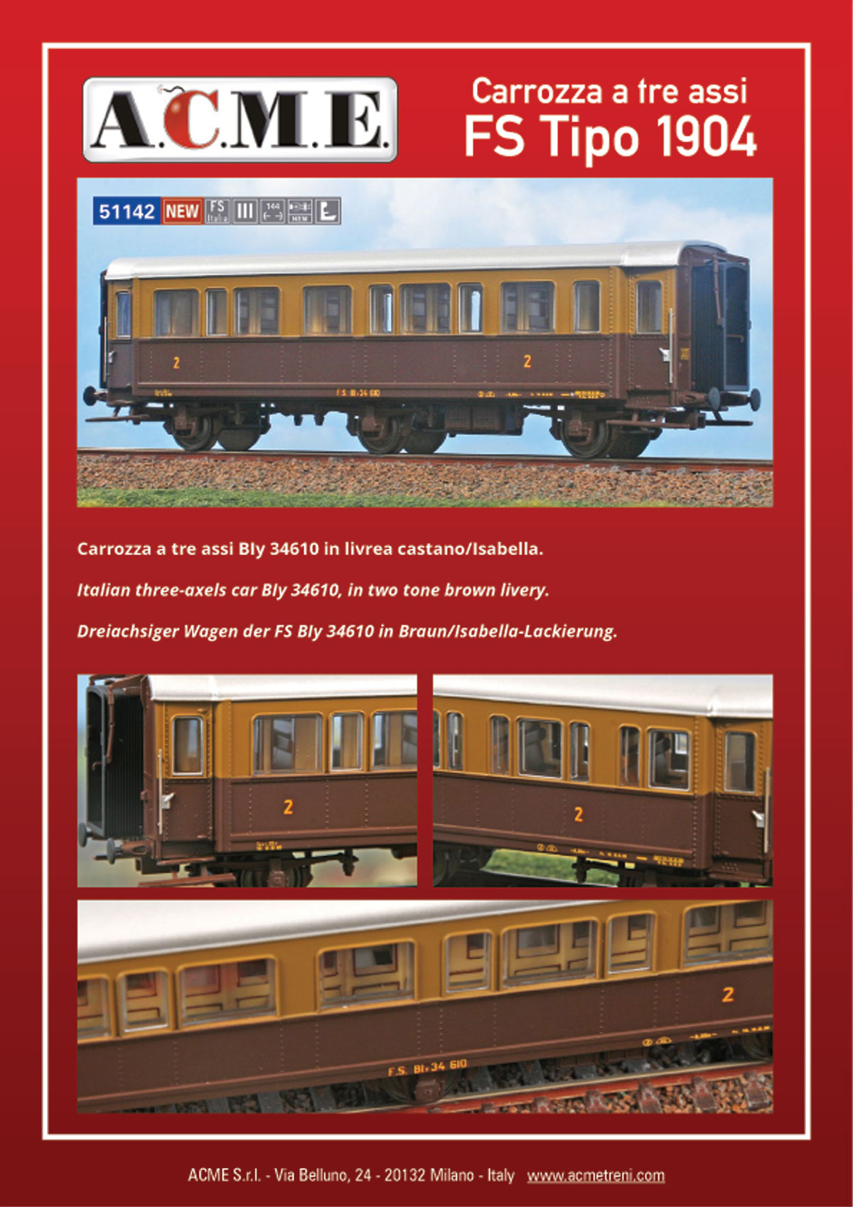 ACME H0 51142 Carrozza a 3 assi Tipo FS 1904 BIy 34610 in livrea castano/Isabella Ep. III