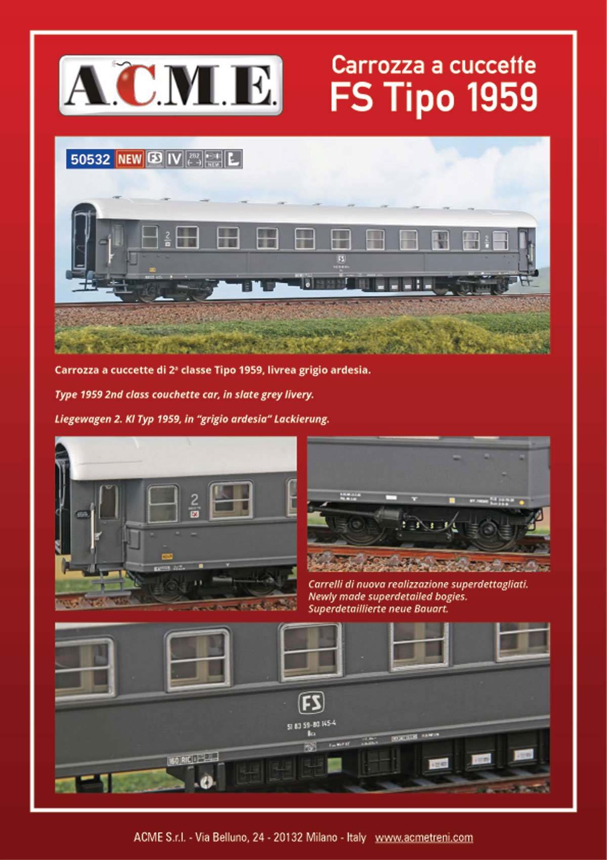 ACME H0 50532 Carrozza a cuccette di 2a classe Tipo 1959, livrea grigio ardesia. FS Ep. IV