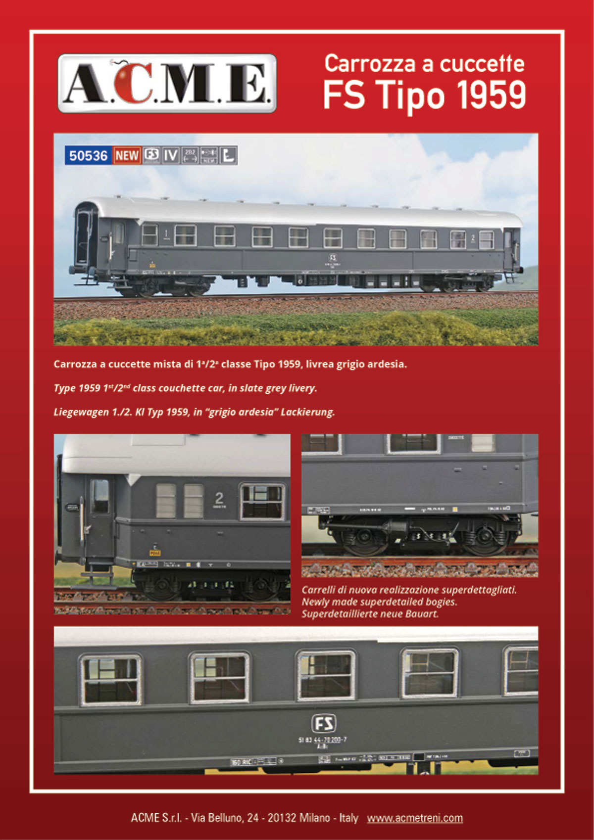 ACME H0 50536 Carrozza a cuccette mista di 1a/2a classe Tipo 1959, livrea grigio ardesia. FS Ep. IV