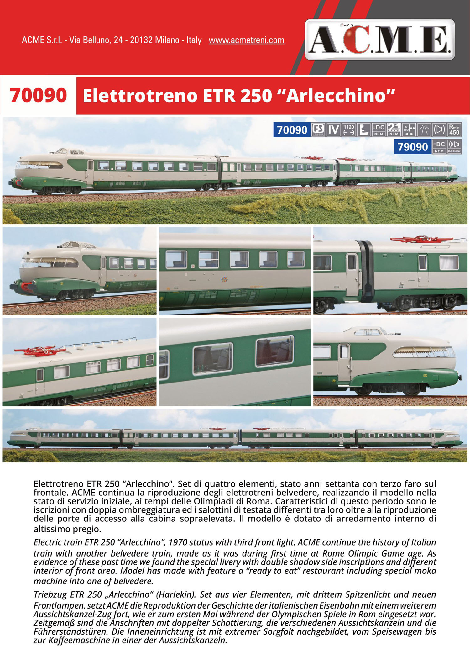 FS Elettrotreno ETR 250 Arlecchino ep.IV Set di quattro elementi con interni di grandissimo pregio ed illuminazione diffusa negli ambienti, meccanica di alta qualità, stato anni '70 con terzo faro sul frontale. Con il nuovo modello dell’ETR 250 "Arlecchino" ACME continua la riproduzione degli elettrotreni belvedere.
